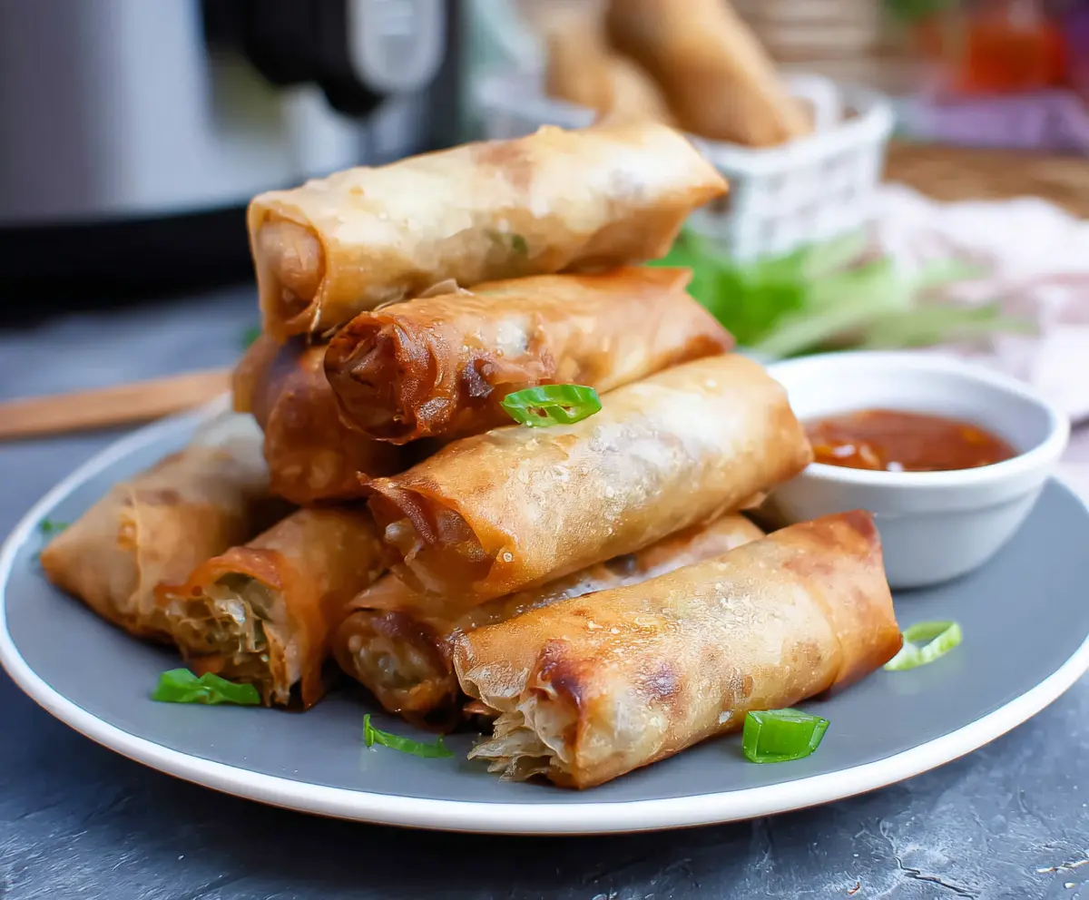 Once the spring rolls are golden brown and crispy, carefully take them out of the air fryer and place them on a plate. Garnish with extra sliced green onions if you like. Serve your hot spring rolls with the delicious dipping sauce on the side, and enjoy this yummy treat!
