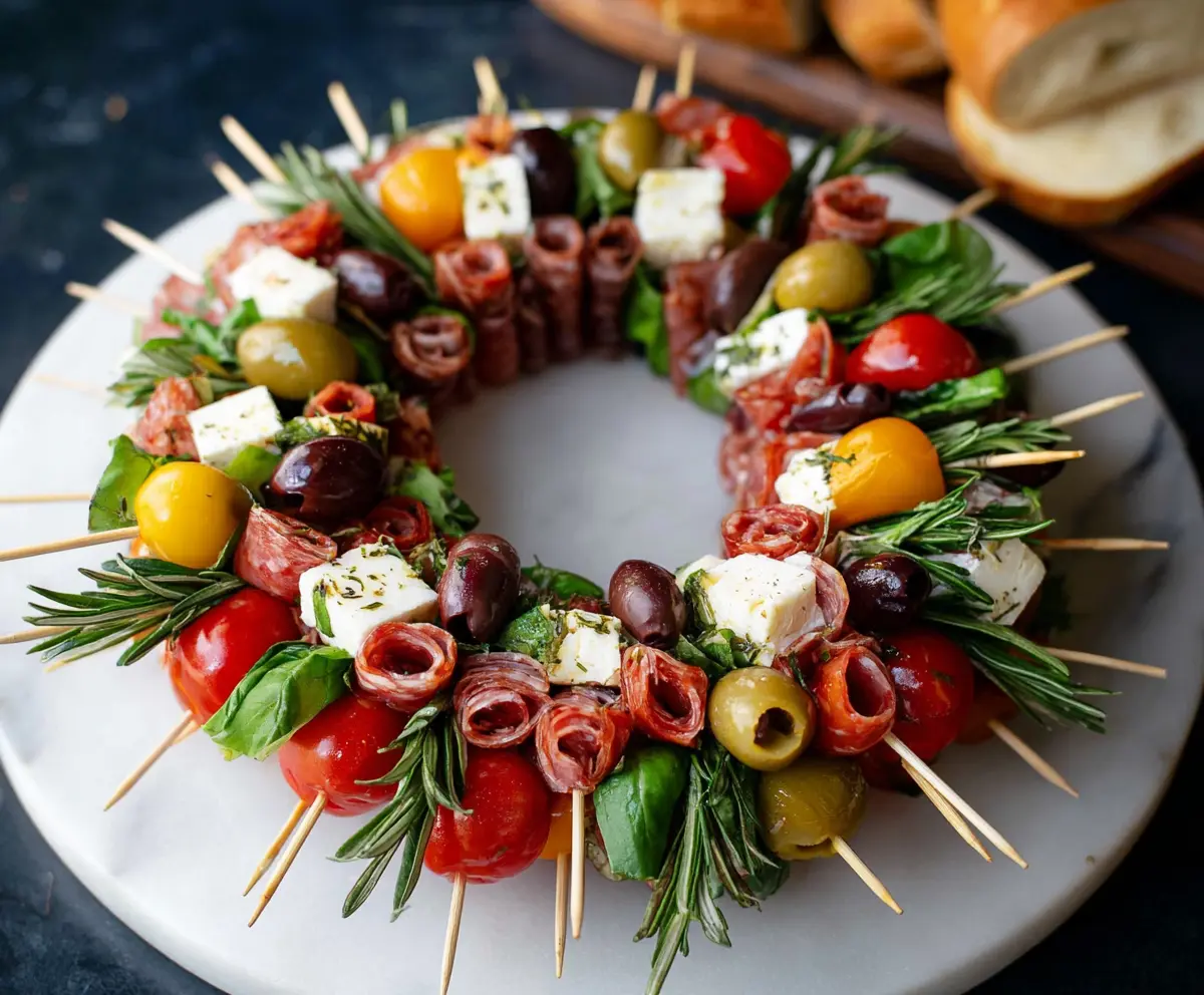 These Antipasto Wreath Skewers are a colorful and tasty treat! They’ll brighten up your party table with a fun mix of olives, cheese, and meats, all on a stick.