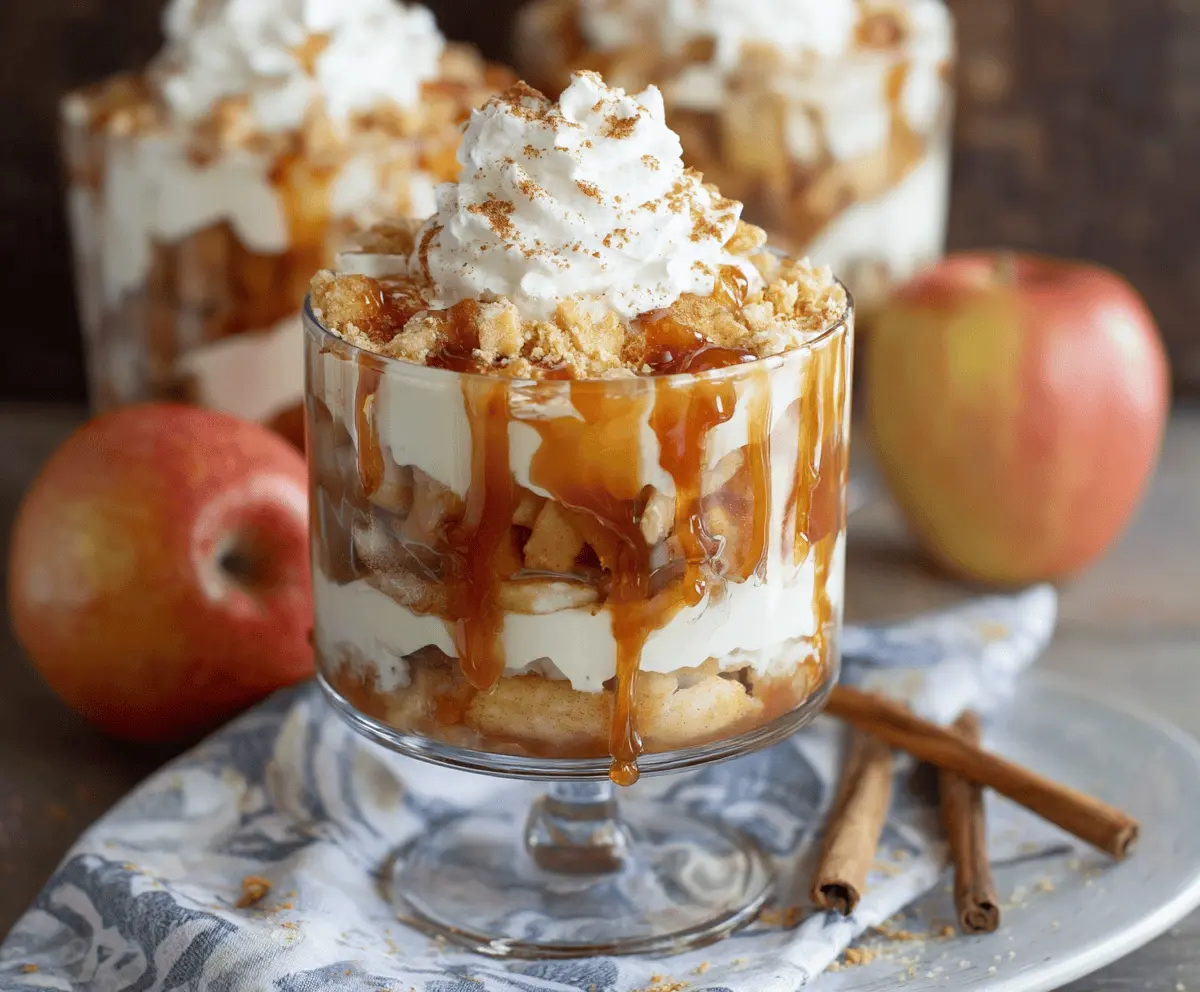 This Apple Pie Trifle is a delightful, layered dessert combining the classic flavors of apple pie with creamy pudding and crunchy cookie layers, all topped off with sweet caramel drizzle. Enjoy your delicious creation!