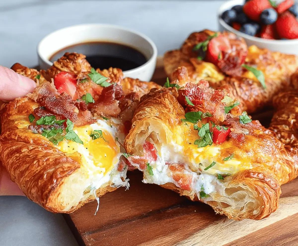 These Baked Croissant Breakfast Boats are a fun and tasty way to start your day! Soft croissants hold delicious egg, cheese, and your favorite toppings for a yummy breakfast treat.