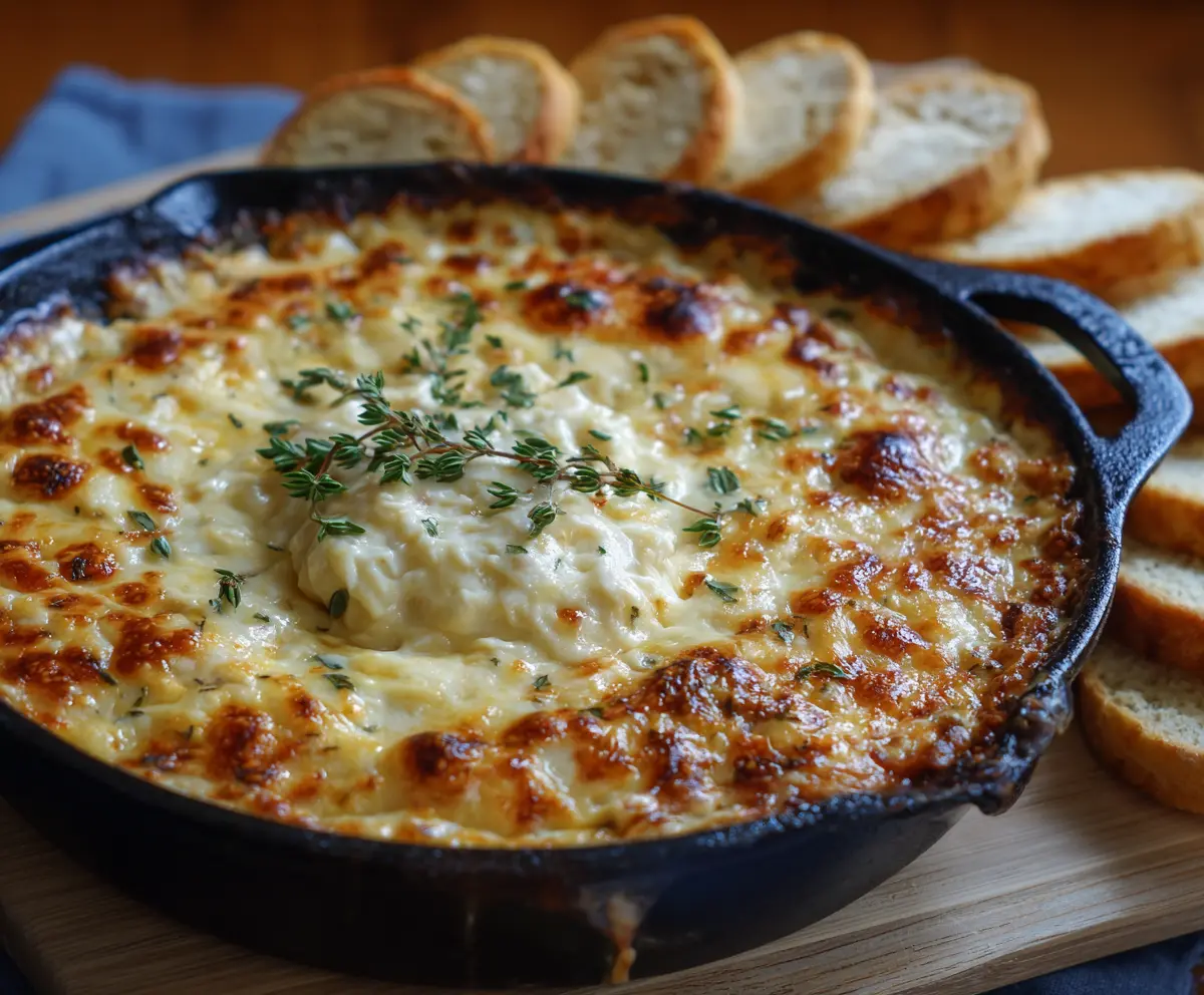 Once it’s out of the oven, let the dip cool for a few minutes. Then, garnish it with chopped green onions and a few sprigs of fresh thyme for that extra pop of color and flavor.