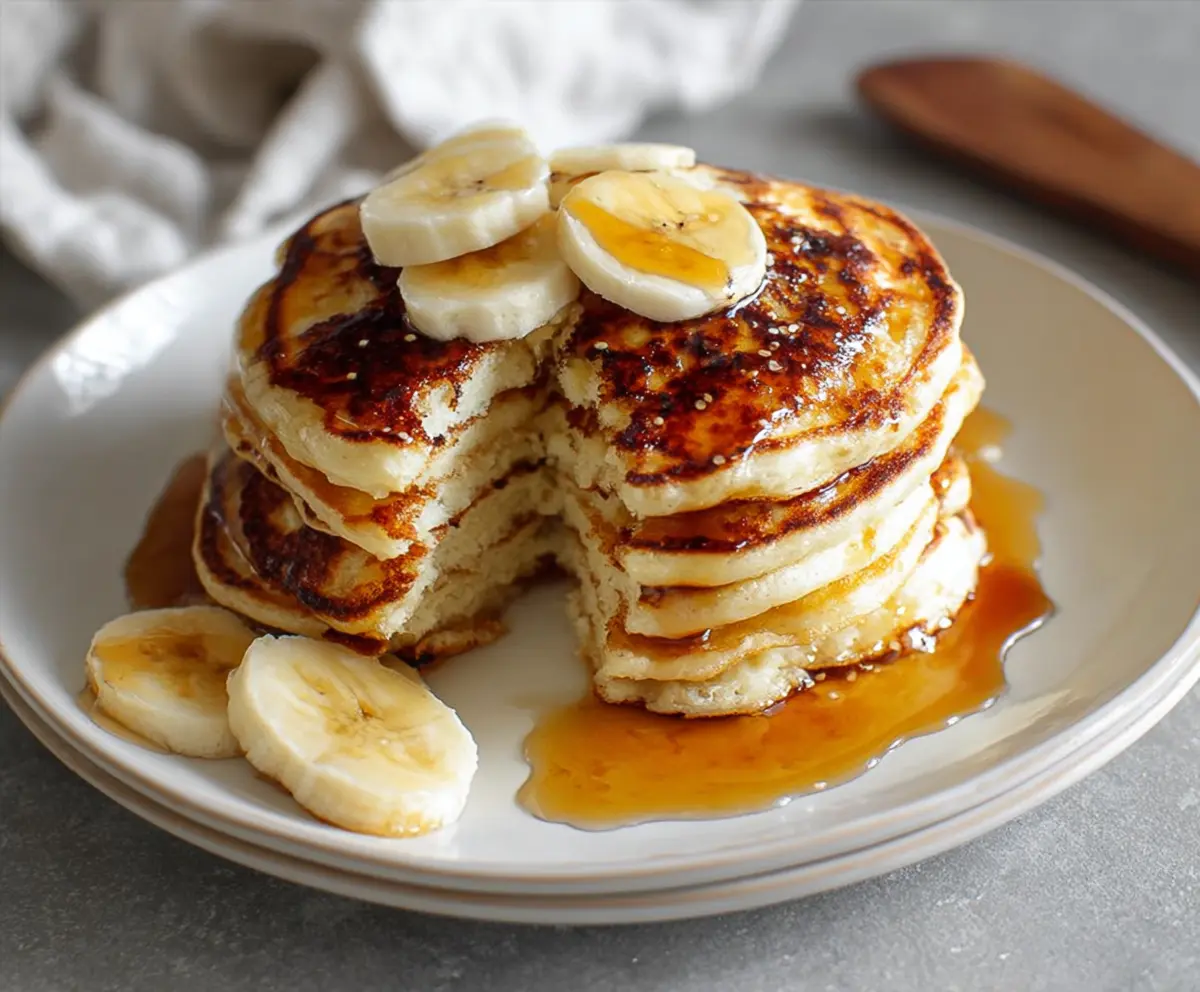 Transfer the cooked pancakes to a warm plate and repeat with the remaining batter. Serve your pancakes stacked, topped with sliced bananas, and drizzled with maple syrup. Enjoy!