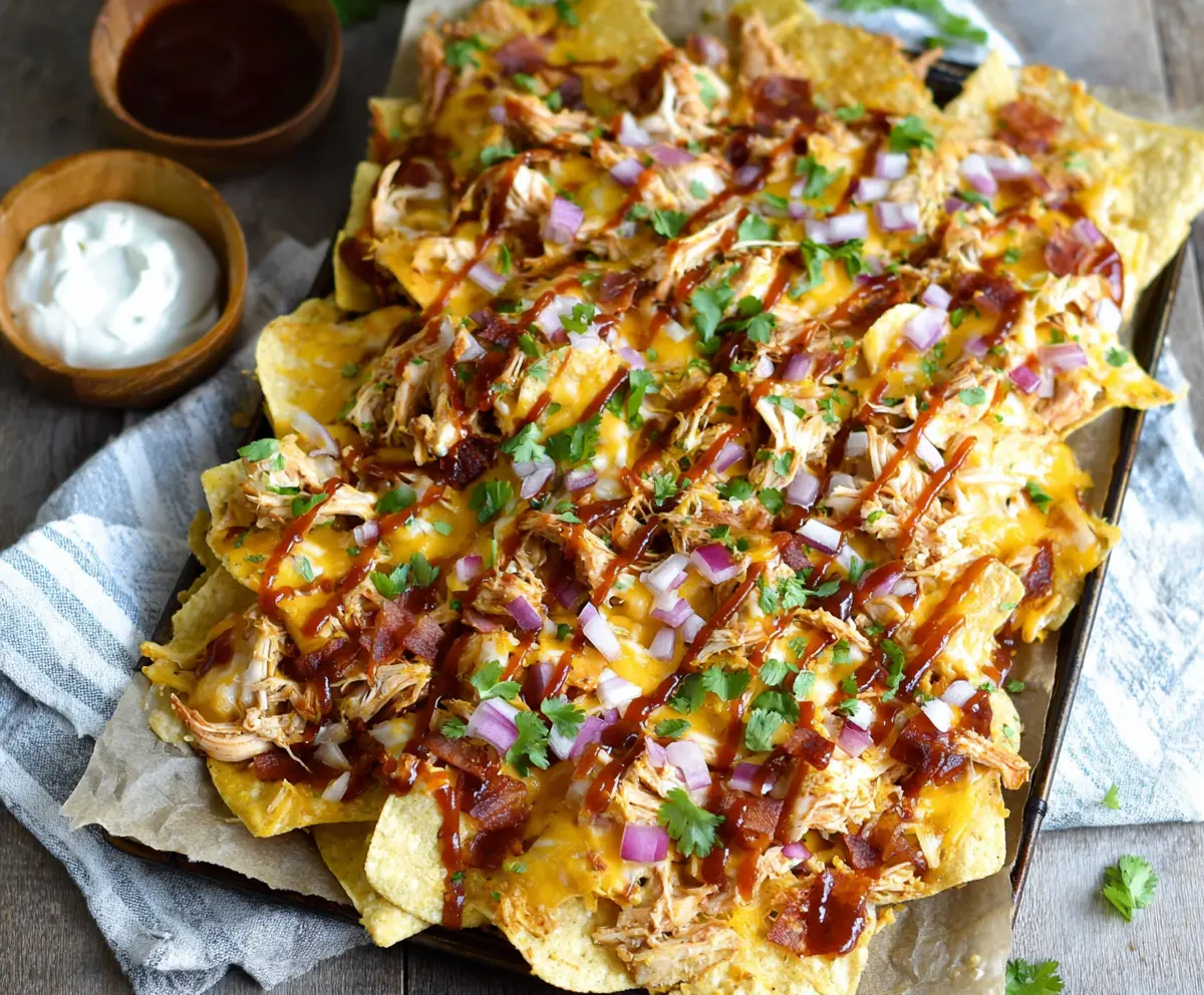BBQ Chicken Nachos are a tasty treat everyone loves! Crispy tortilla chips are piled high with shredded chicken, gooey cheese, and drizzled with zesty BBQ sauce for a fun snack.