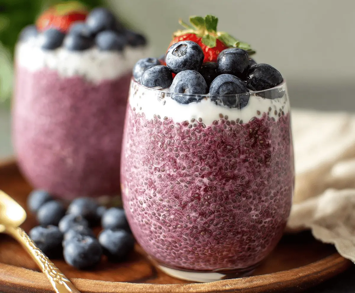 When you’re ready to serve, take the pudding out of the fridge and give it one final stir. Spoon the pudding into serving glasses or bowls. Top with fresh blueberries and, if you like, add a dollop of yogurt or whipped cream on top. A few fresh mint leaves make for a lovely garnish and an extra flavor kick!
