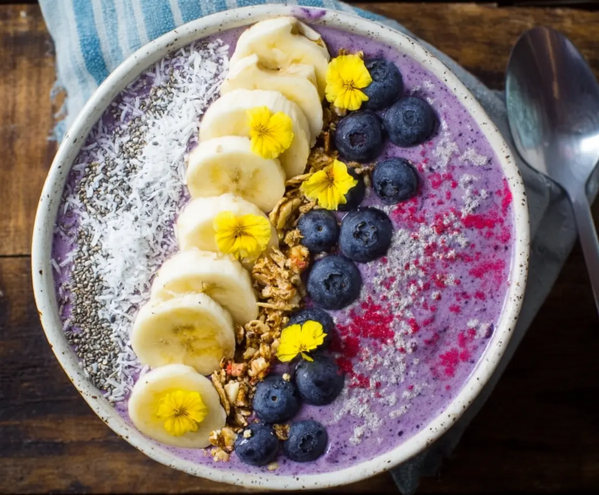This recipe creates a creamy, antioxidant-rich smoothie bowl topped with fresh fruit, chia seeds, coconut, and nuts for texture and nutrition. Perfect for starting your day on a healthy note!
