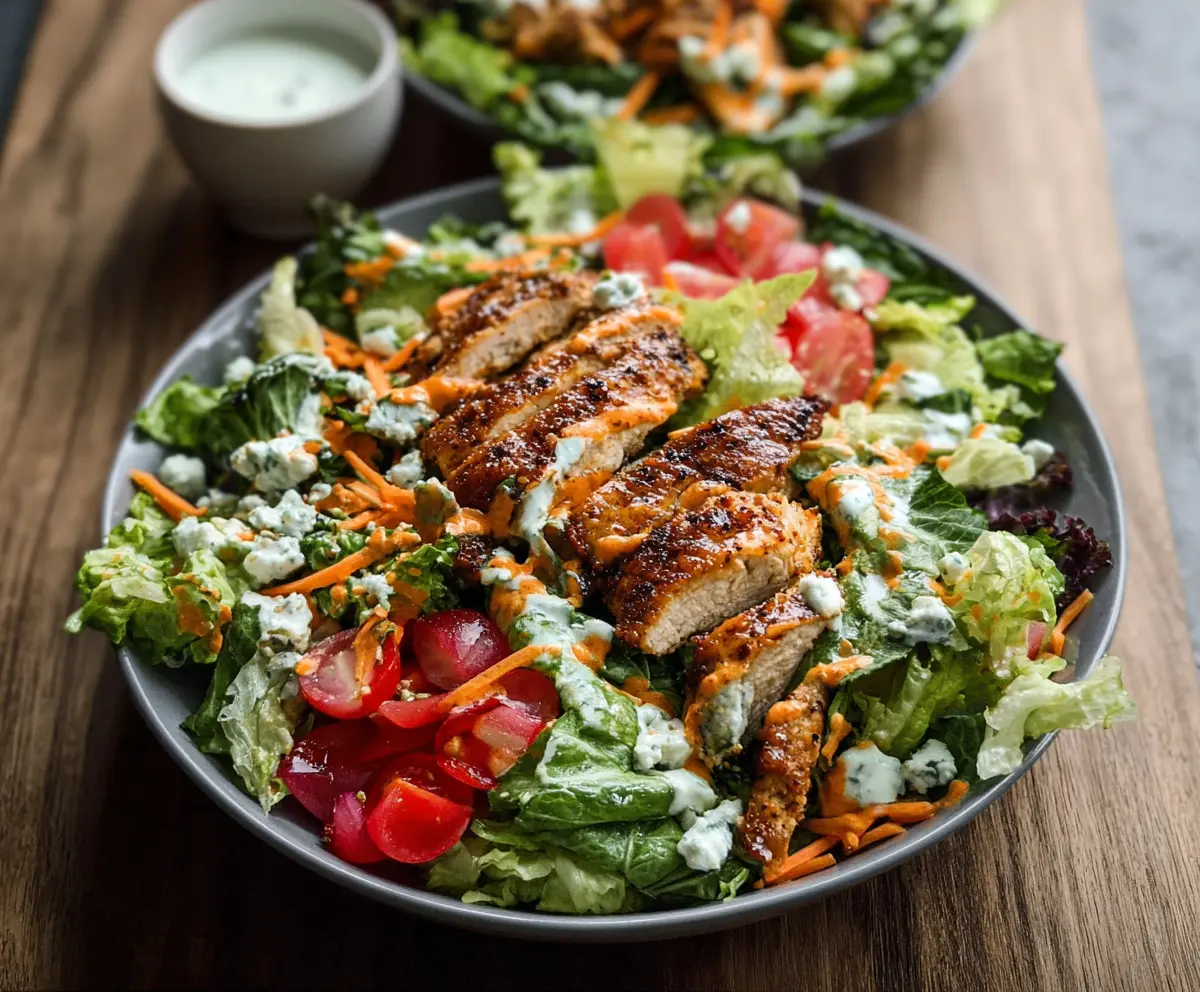 This dish combines juicy grilled chicken with zesty buffalo sauce drizzled over fresh greens and hearty veggies, all topped off with a creamy ranch dressing. Perfect for a quick meal and full of flavor!