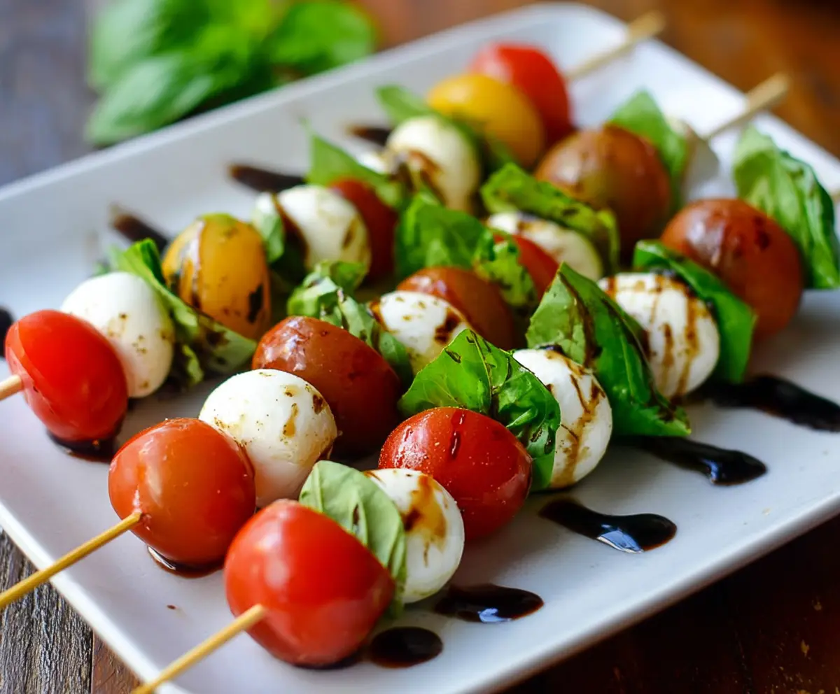 These Caprese Skewers are a fun and fresh snack! They combine juicy cherry tomatoes, creamy mozzarella balls, and fragrant basil leaves, all drizzled with tasty balsamic glaze.