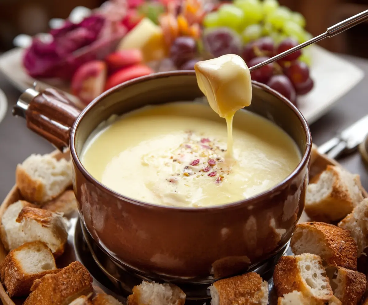 Cheese fondue is a fun and creamy dish made by melting delicious cheeses together, usually Gruyère and Emmental. Dip fresh bread into this warm cheese goodness!