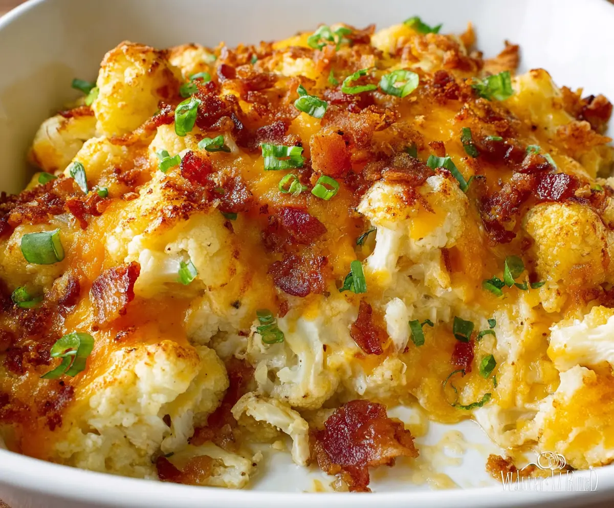 This cheesy loaded cauliflower casserole is a fantastic low-carb comfort dish packed with flavors of cheese and bacon. Enjoy every bite!