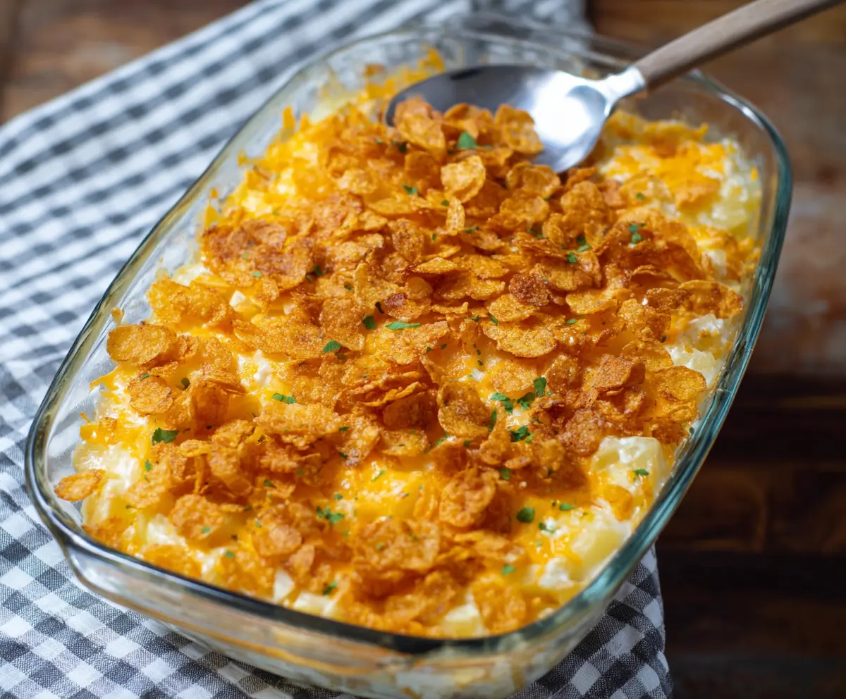 This dish is a tasty mix of creamy potatoes topped with crunchy corn flakes. It’s simple, hearty, and super comforting—perfect for family gatherings!