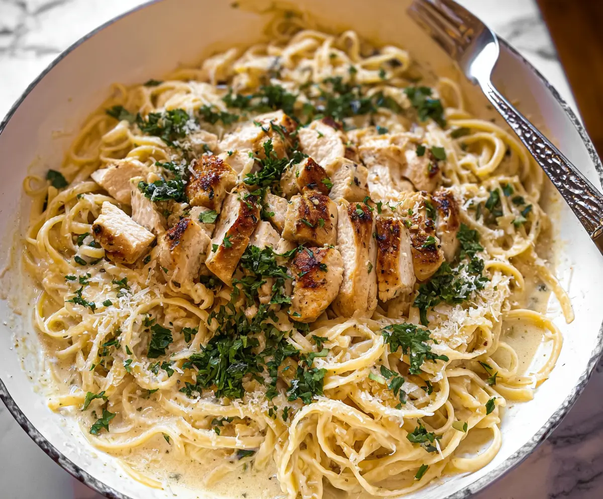 This classic creamy plate features tender chicken atop rich Parmesan Alfredo coating the fettuccine noodles, garnished with fresh parsley and served with crisp garlic bread. Perfect for a comforting meal!