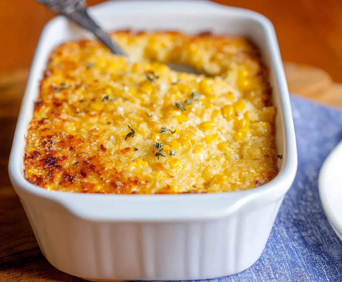 Pour the corn mixture into your prepared baking dish. Spread it out evenly. If you’d like, you can sprinkle some fresh thyme leaves or chopped parsley on top for extra flavor and a lovely presentation.