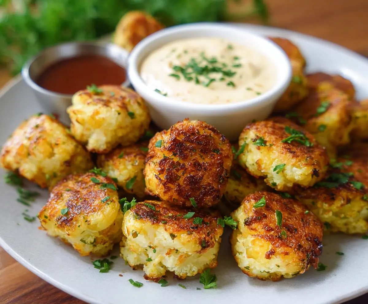 Finish them off by garnishing with some extra chopped parsley for a pop of color. Serve warm, alongside your favorite dipping sauce, like a herbed yogurt dip, ranch dressing, or garlic aioli. Enjoy your delicious crispy cauliflower tots as a snack or appetizer!
