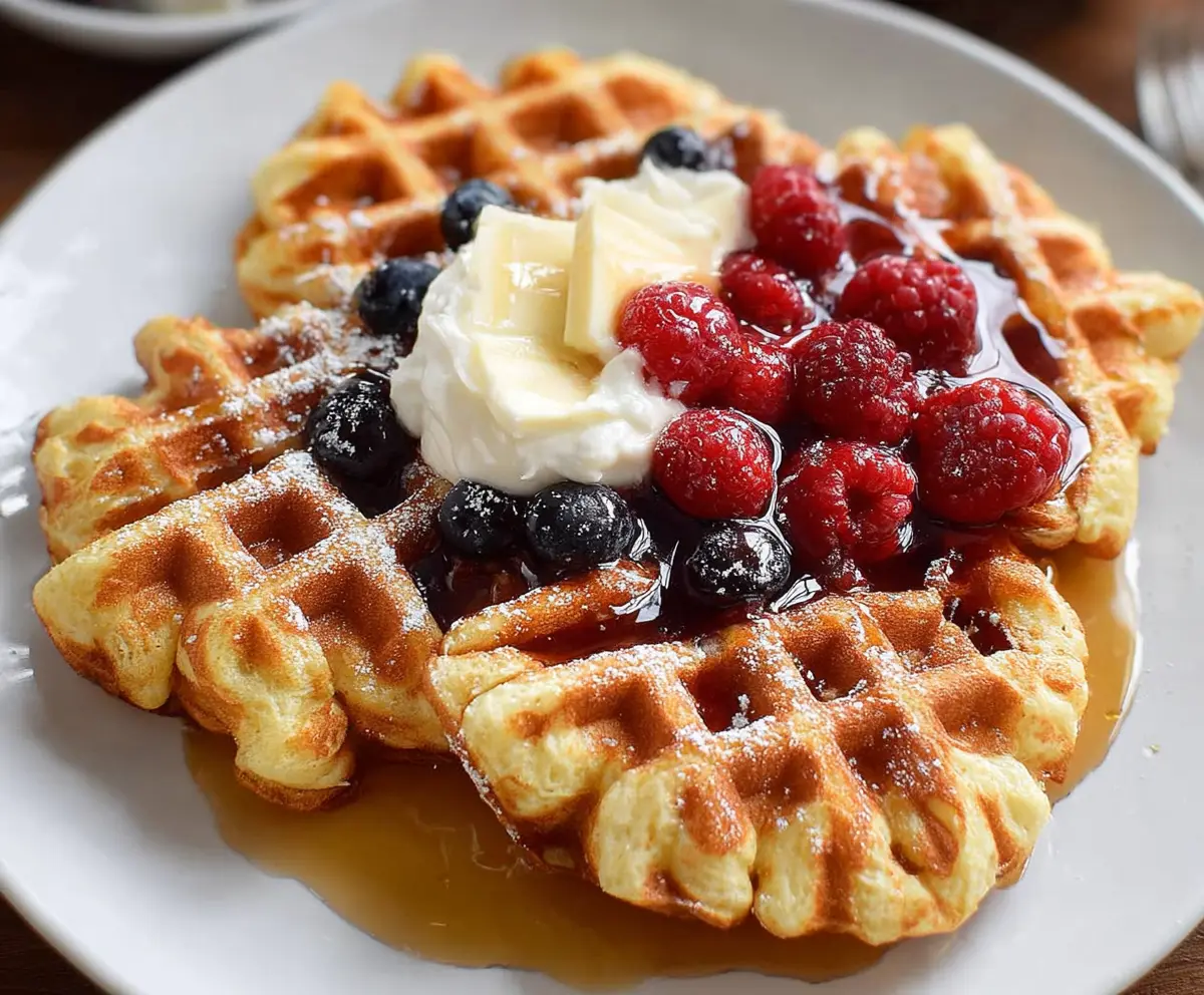 Once cooked, transfer the waffles to a plate. Top them with a dollop of whipped cream, fresh strawberries, and blueberries. Drizzle with maple syrup and sprinkle lightly with powdered sugar if you like.