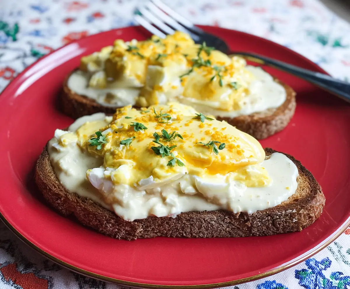 Now, it’s time to put it all together! Spoon the creamy egg mixture evenly over each slice of toasted bread.