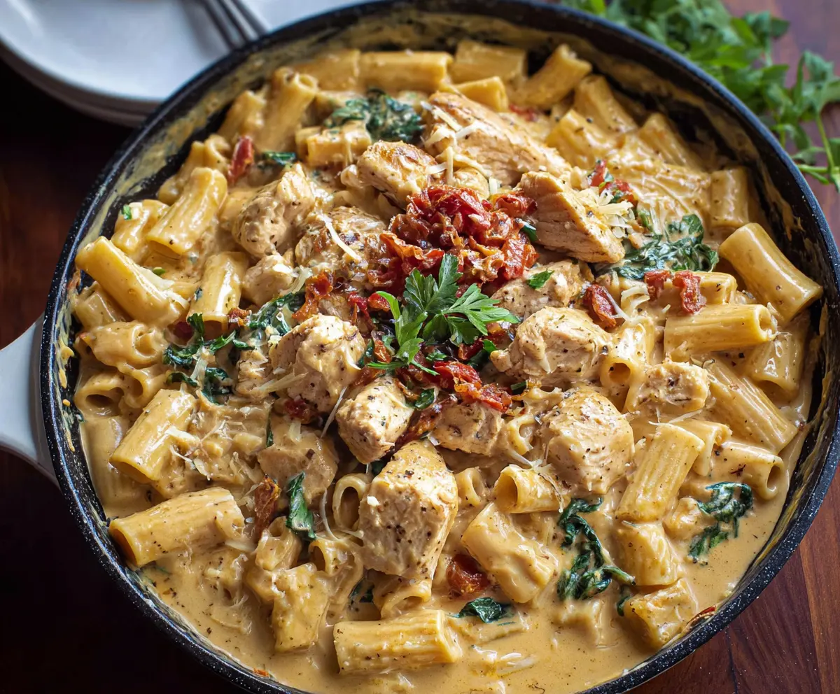 Creamy Tuscan Chicken Pasta is a delightful dish packed with flavor! Tender chicken joins sun-dried tomatoes and fresh spinach in a rich, creamy sauce, all served over pasta. Yum!