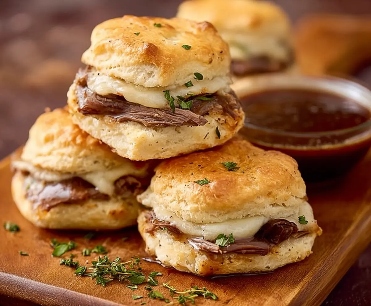 Enjoy your homemade French Dip Biscuits, filled with tender beef, melted cheese, and flaky buttery biscuits, all complemented by a flavorful dipping sauce!