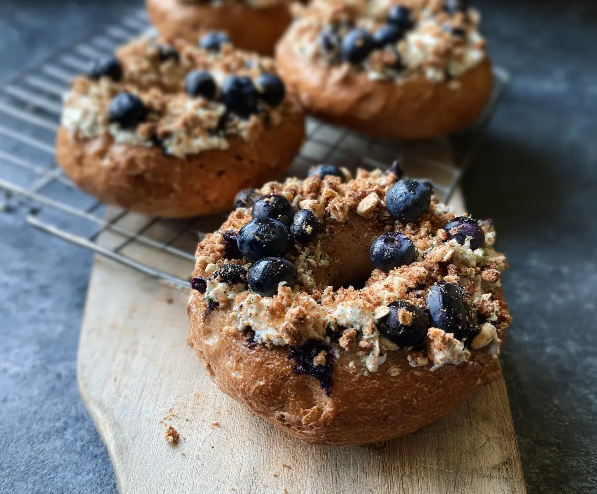These tasty bagels combine chewy goodness with creamy Greek yogurt and juicy blueberries, making for a delicious breakfast! The crunchy topping adds a delightful twist.