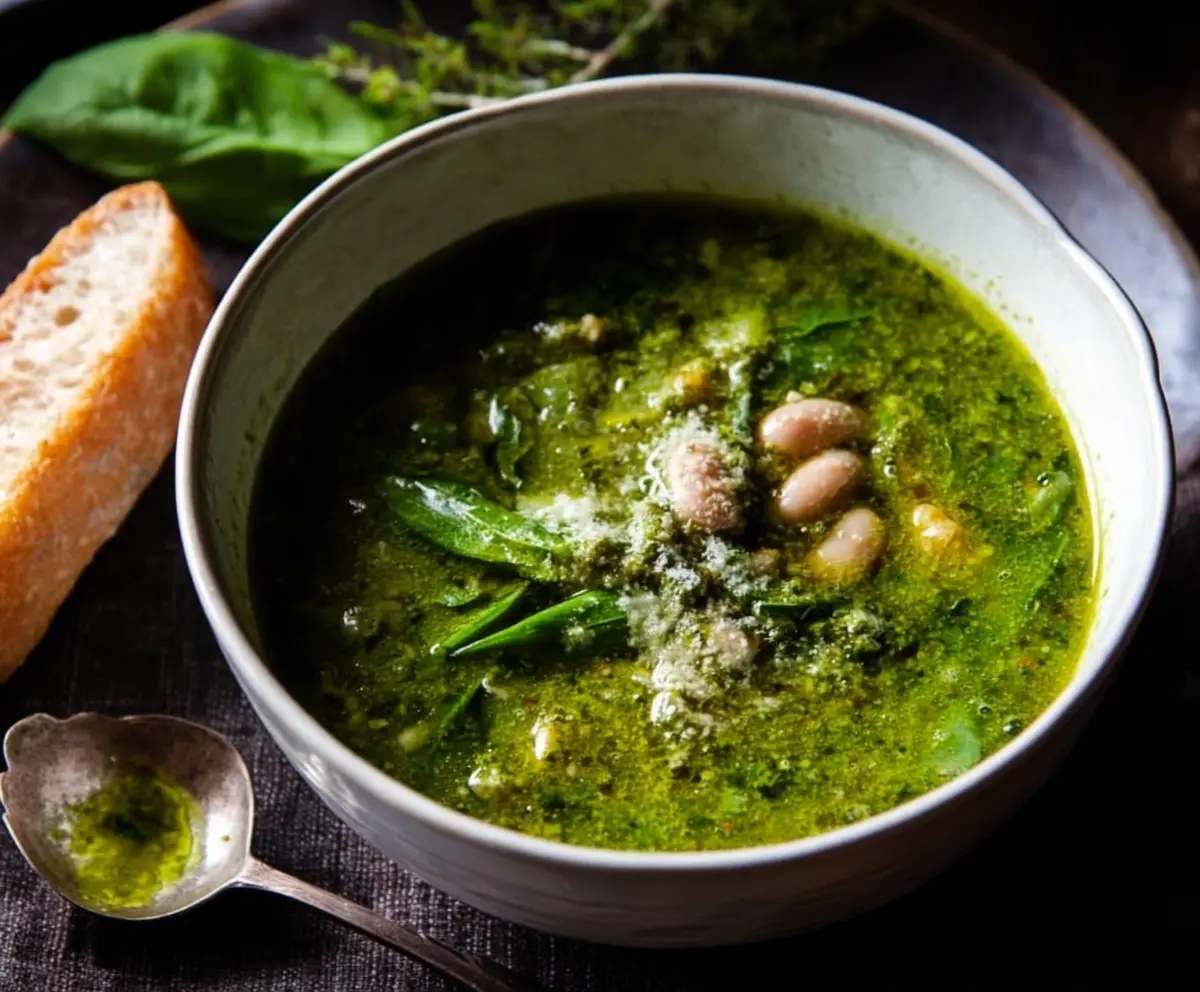 Serve the soup hot alongside some crusty bread for dipping. Enjoy your vibrant, delicious green soup packed with fresh greens, hearty beans, and rich pesto flavor!