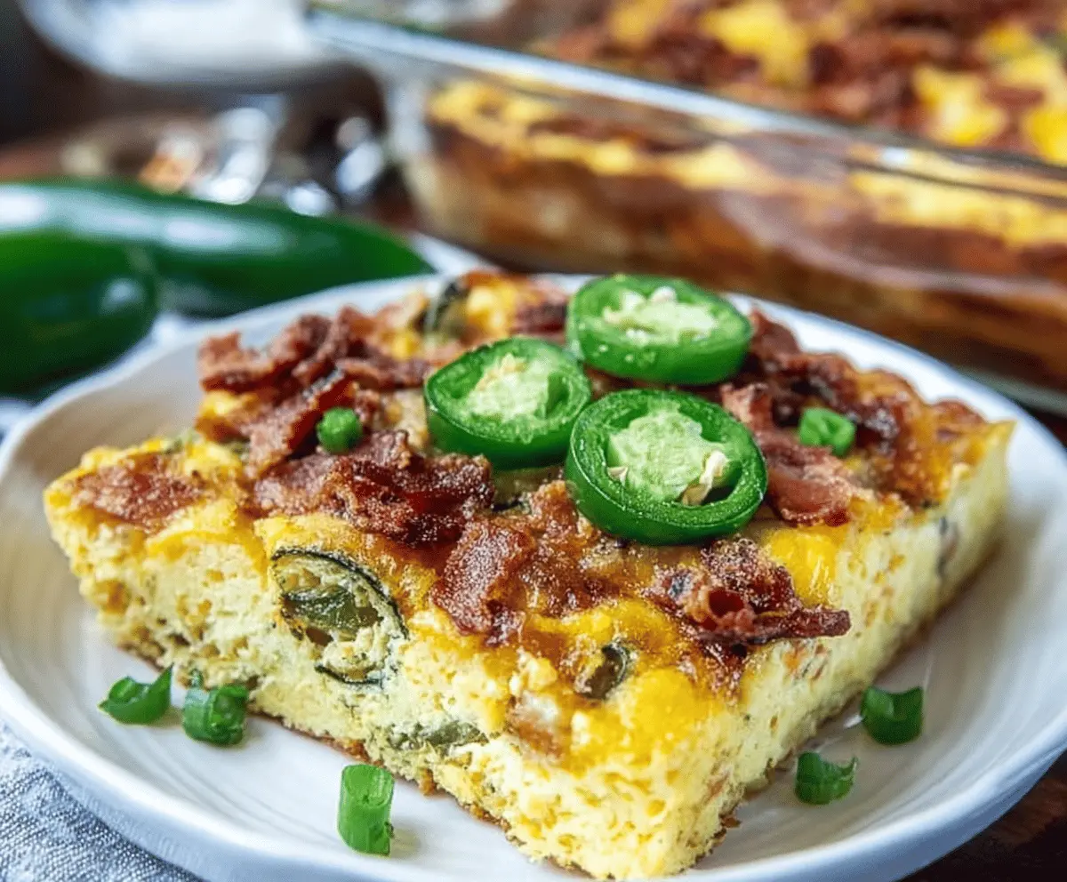 Enjoy this deliciously creamy, cheesy, and spicy breakfast casserole that captures the essence of jalapeño poppers in every bite!