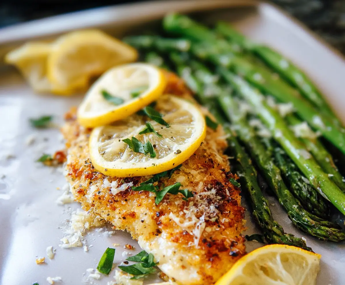 Enjoy your flavorful, crispy Lemon Parmesan Chicken accompanied by perfectly roasted asparagus!