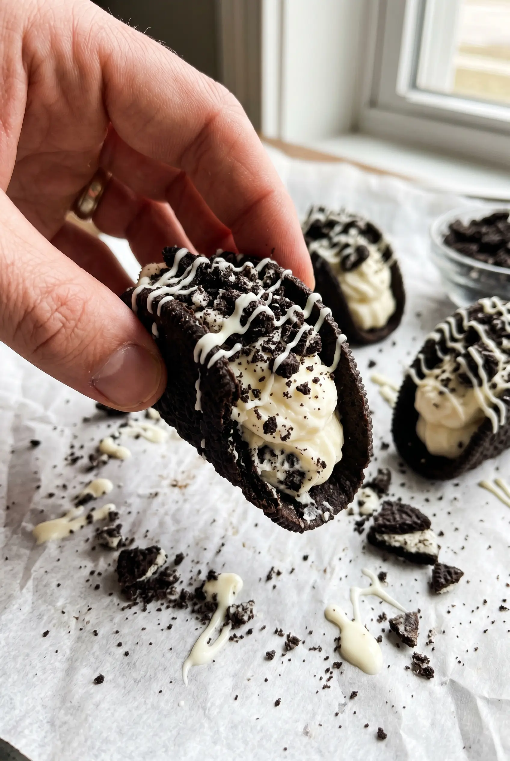 Swap the Oreos for chocolate graham crumbs, chocolate sandwich cookies, or even mint cookies if you want a cooler, sharper flavor. The texture stays the same as long as you crush the cookies finely, but the sweetness level changes depending on the cookie you choose. Mint cookies make these taste more like a holiday dessert taco.