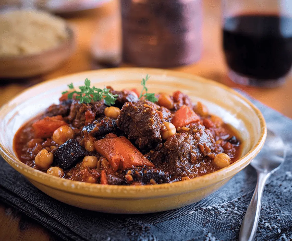 Enjoy a warm, comforting Moroccan beef stew full of aromatic spices and hearty flavors!