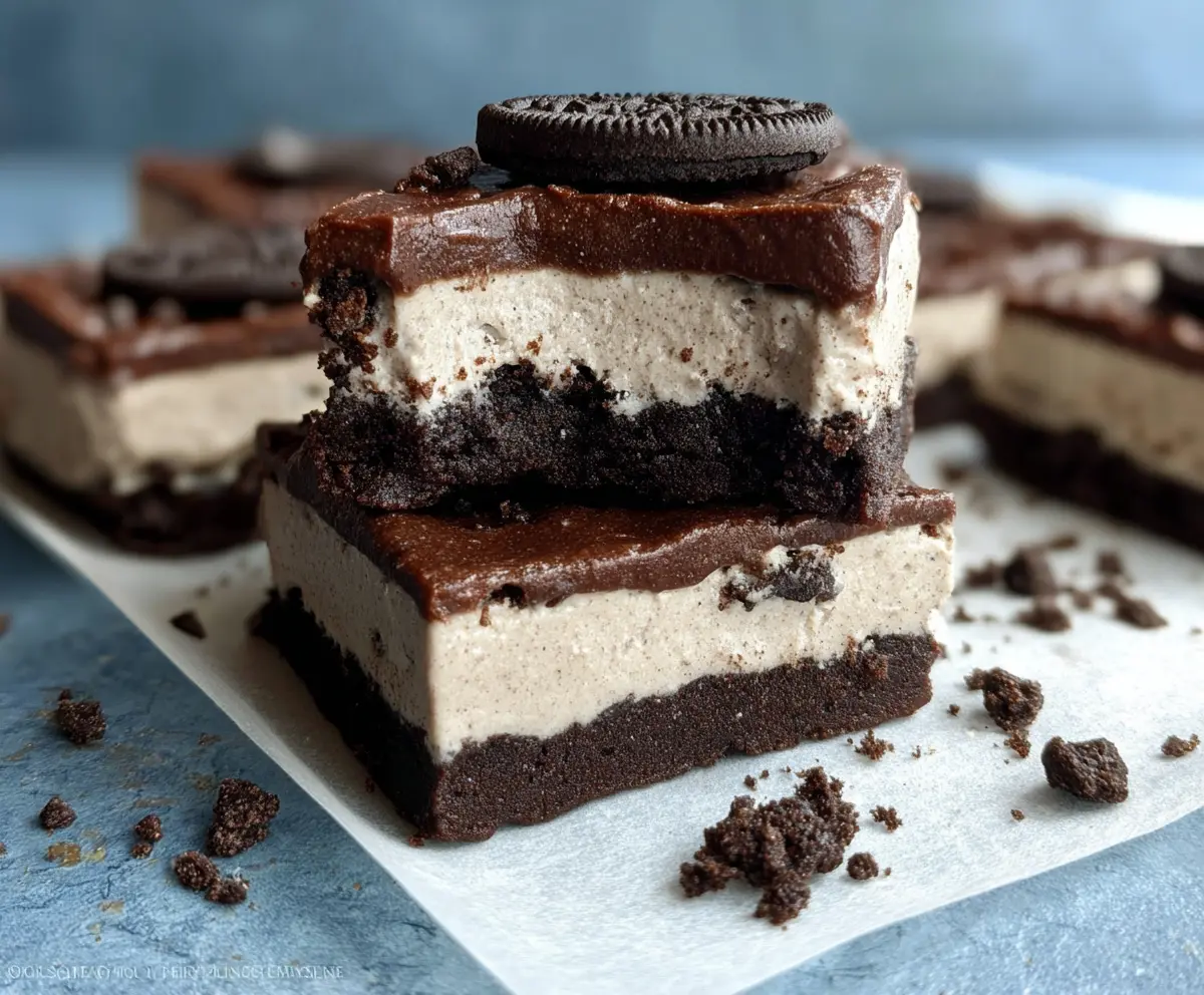 These bars have a rich chocolatey crust with a creamy, protein-packed Oreo filling topped with classic Oreo cookies. Perfect for a no-bake snack or dessert!