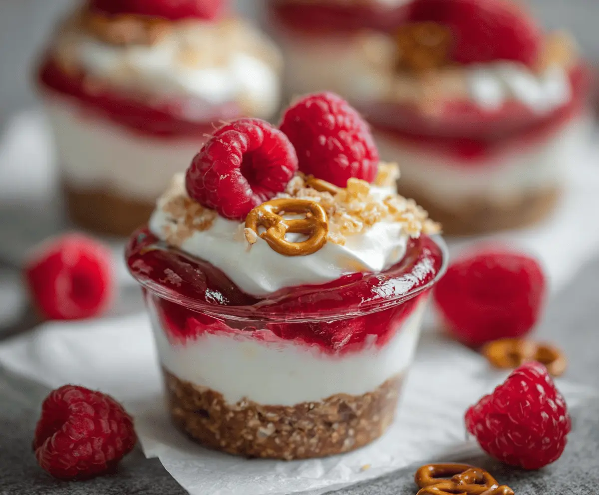 These No-Bake Raspberry Pretzel Cups are a tasty treat! They have a crunchy pretzel base, a creamy raspberry filling, and a fluffy topping. Perfect for when you want something sweet without the oven.