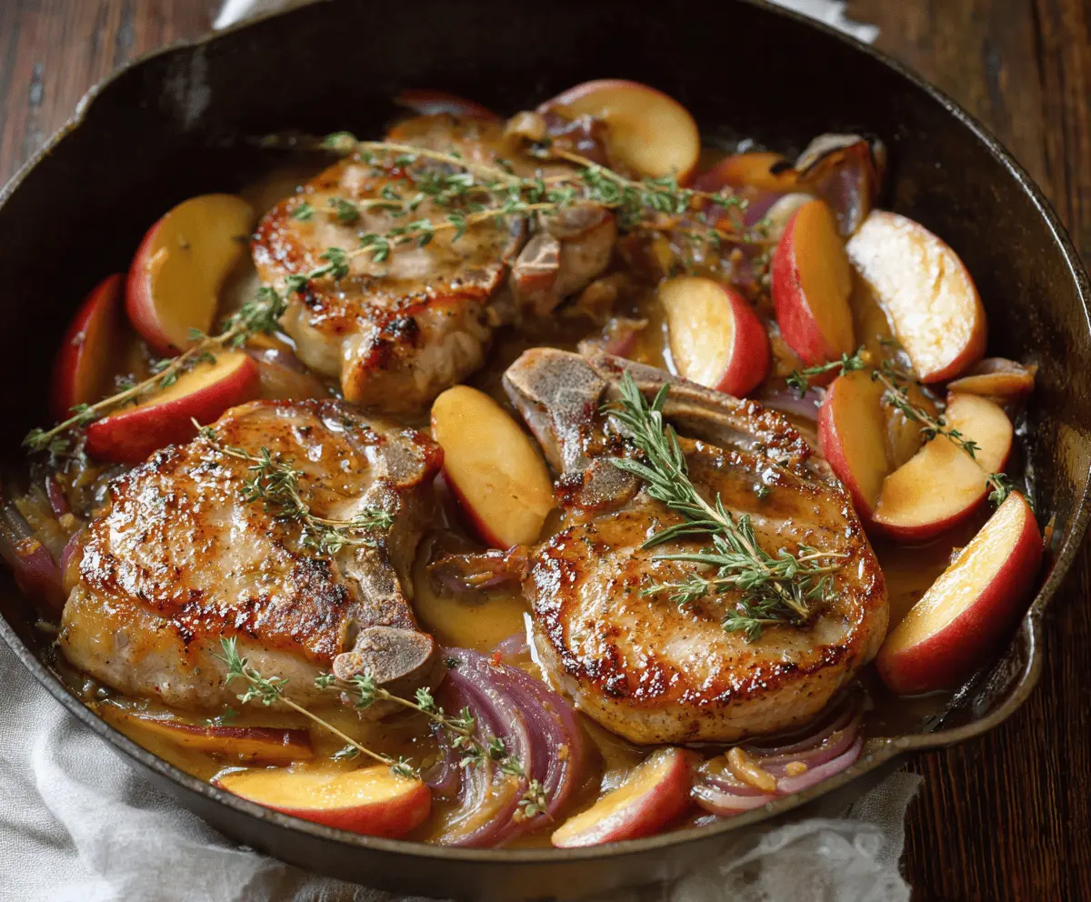 Return the seared pork chops to the skillet, placing them among the apples and onions. Cover the skillet with a lid, reduce the heat to medium-low, and let everything cook together for about 6 to 8 minutes, or until the pork chops reach an internal temperature of 145°F (63°C).