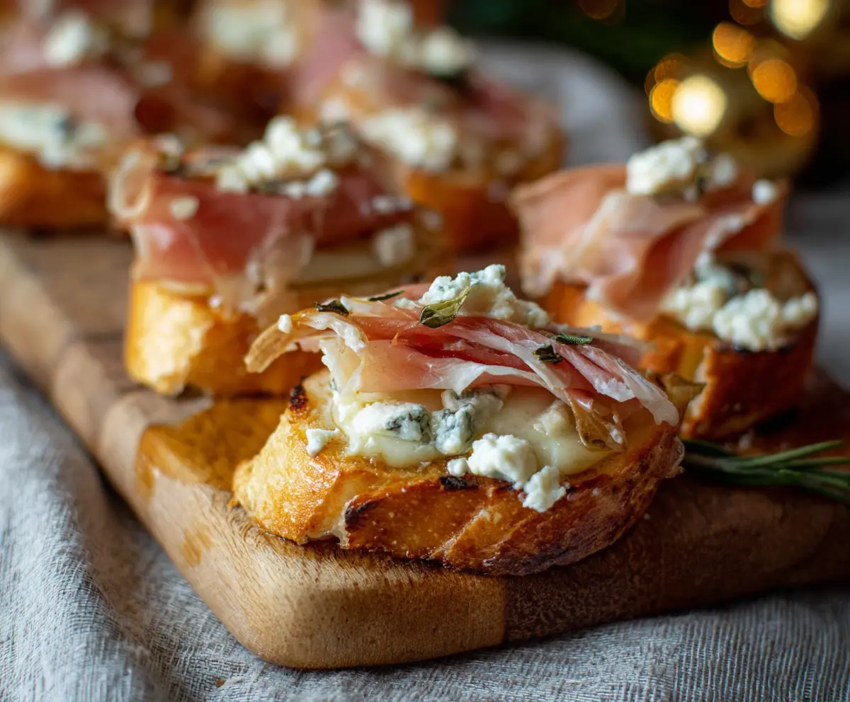 These tasty Prosciutto Pear Gorgonzola Crostini are the perfect appetizer! With crispy bread topped with sweet pears, salty prosciutto, and creamy Gorgonzola, they’re hard to resist.