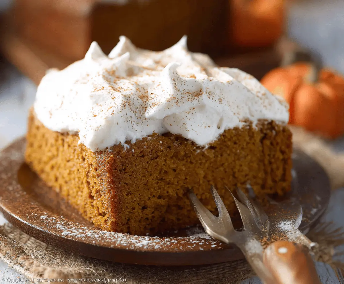 Slice the cake into squares and serve it up! Enjoy this tasty, moist pumpkin cake that’s perfect for any occasion!