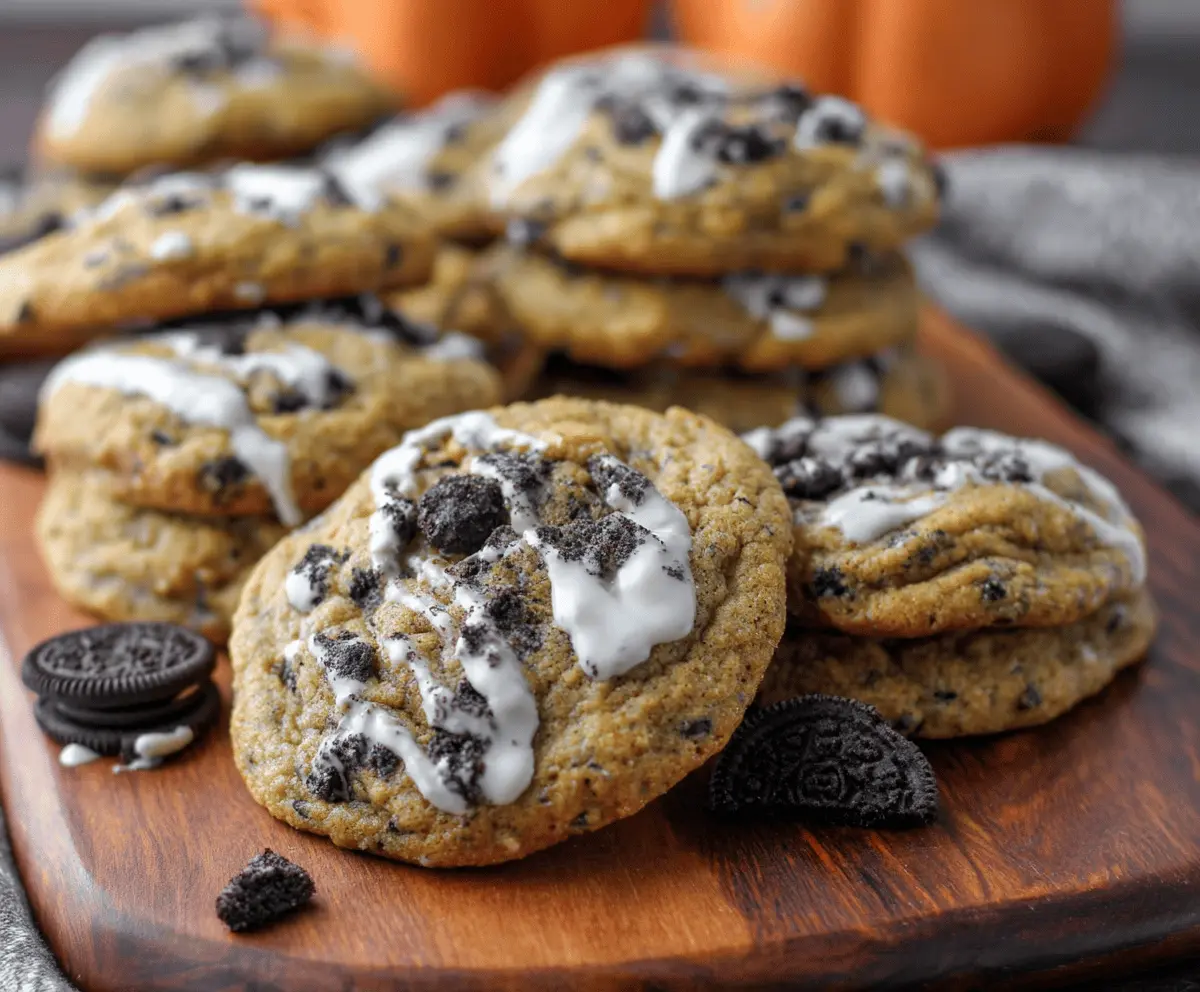With a delightful mix of pumpkin spice, Oreo crunch, and creamy white chocolate, these cookies make for an irresistible fall treat!