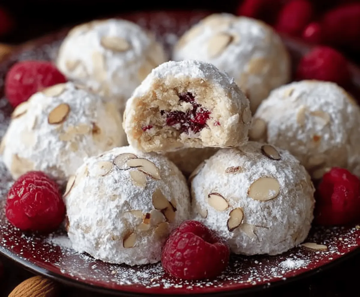 Raspberry Almond Snowball Cookies are a sweet treat that combines the tartness of raspberries with nutty almond flavors. These soft, buttery cookies are rolled in powdered sugar, making them look like little snowballs!
