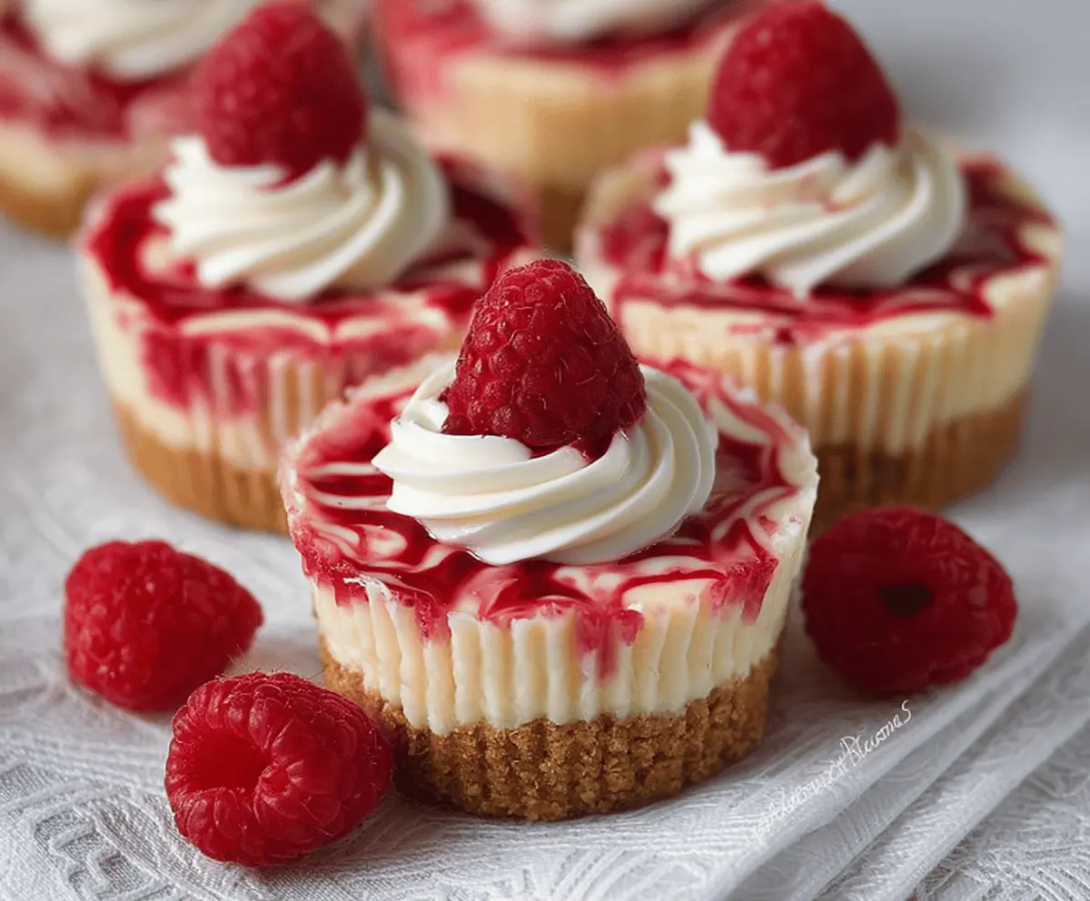 Pipe or spoon the freshly whipped cream onto the top of each cheesecake cupcake. Finish with a garnish of fresh raspberries, and they’re ready to enjoy! Serve chilled for the best flavor.