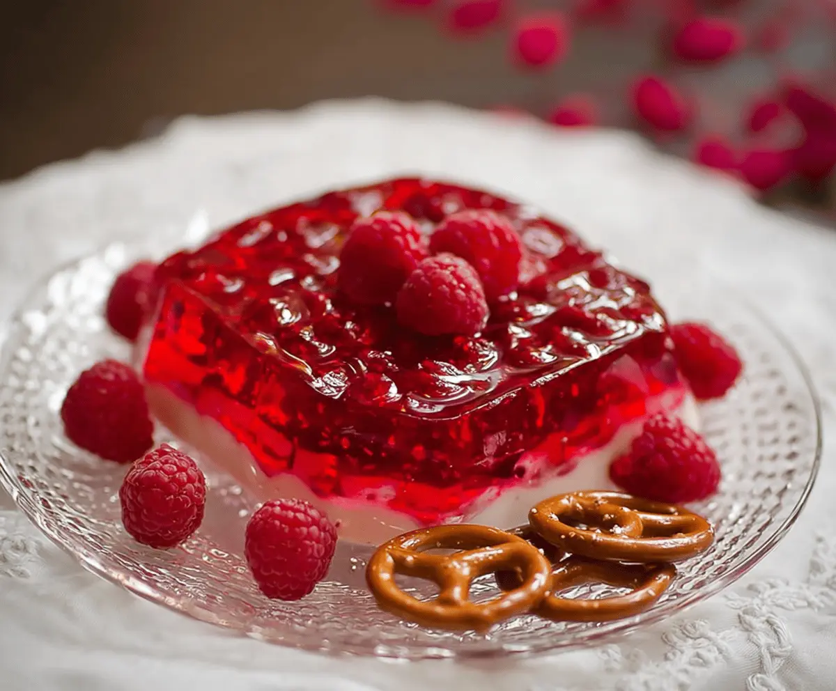 Refrigerate the dessert for at least 4 hours, or until the gelatin is completely set. When you’re ready to serve, cut it into squares. Optional: garnish each piece with a few more fresh raspberries, and maybe add a couple of pretzels on the side for extra crunch!