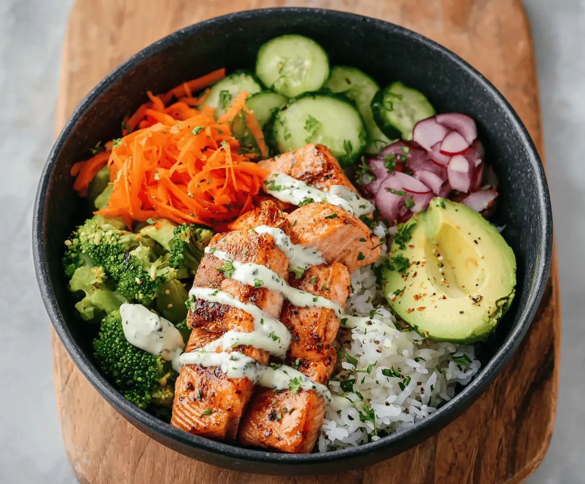 This bowl features flaky, flavorful salmon paired with a fresh mix of vegetables and fluffy rice — perfect for a satisfying and healthy meal!