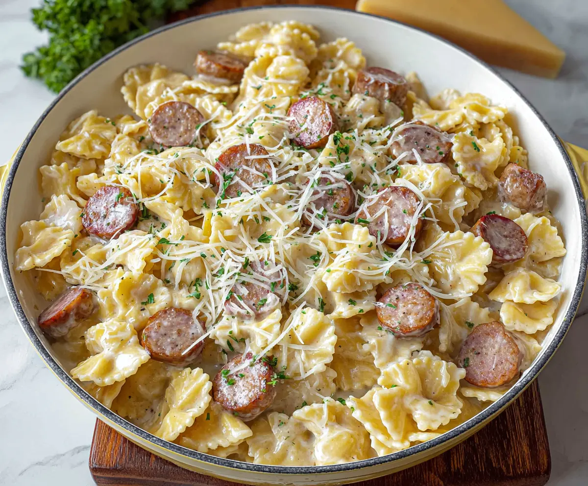 Serve your delicious Sausage Alfredo Pasta hot, garnished with extra Parmesan cheese and a sprinkle of fresh parsley if desired. Enjoy every bite!