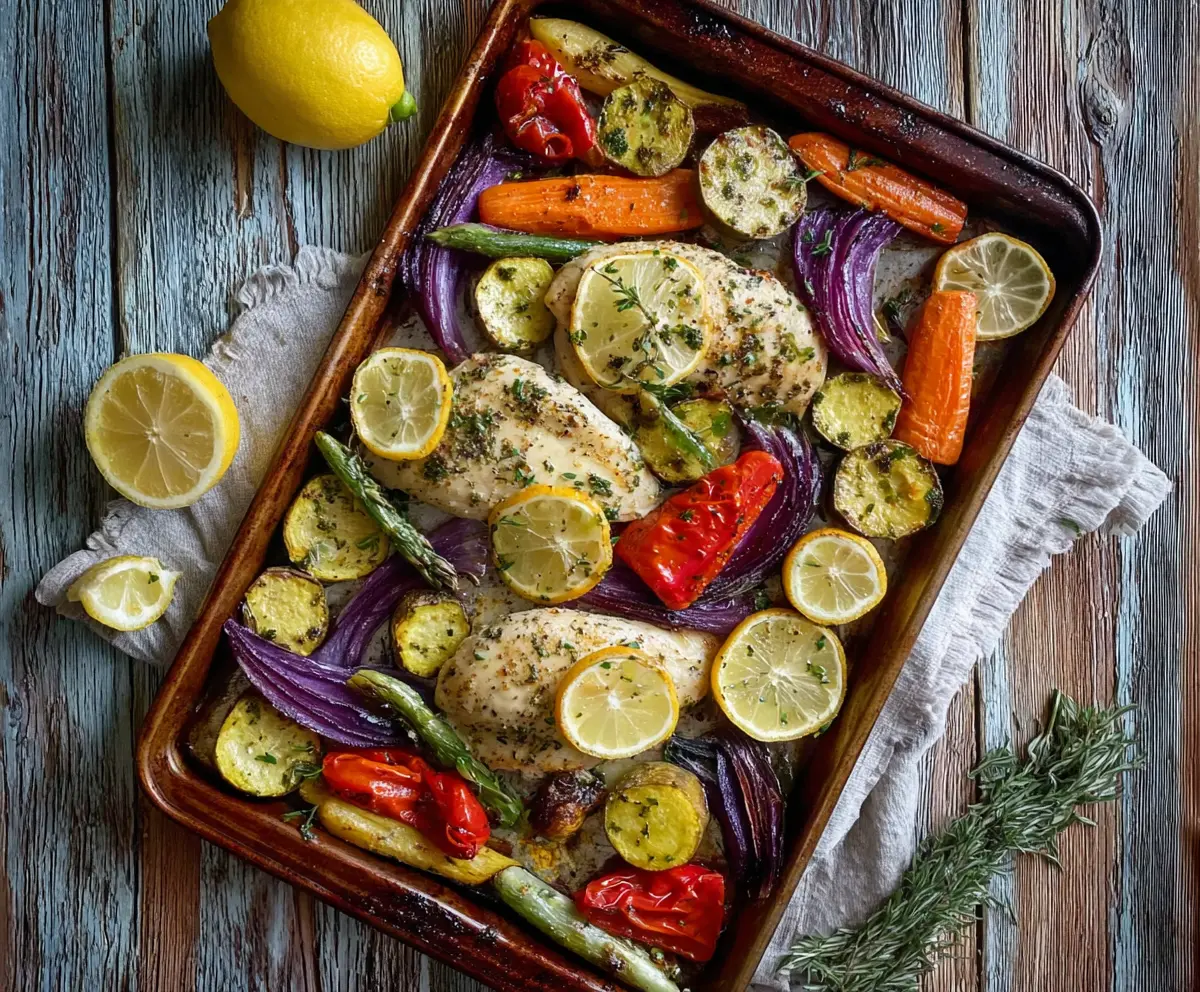 This recipe combines juicy, herb-infused chicken breasts with a colorful, savory mix of roasted vegetables, all brightened by fresh lemon slices. Enjoy!