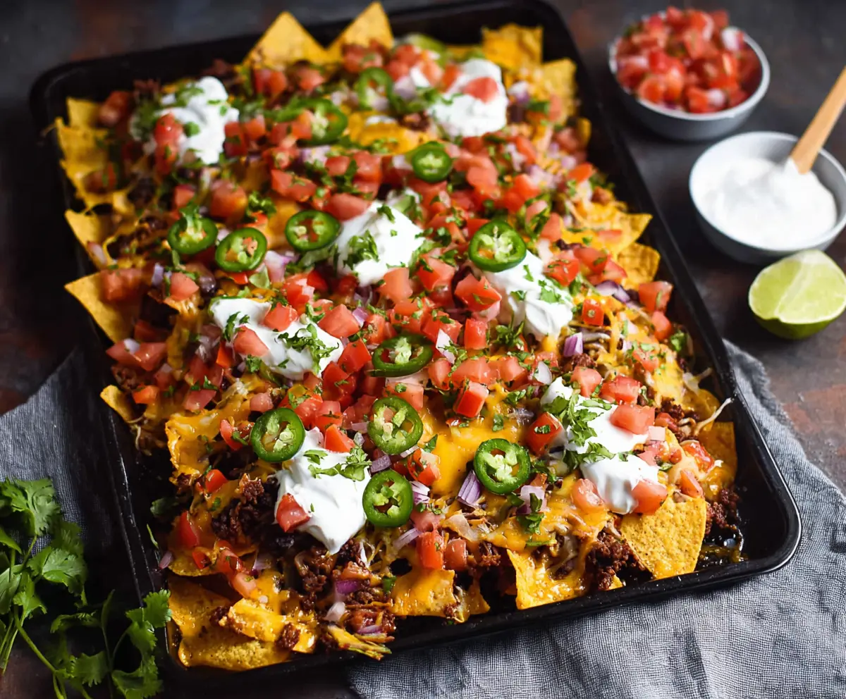 Once out of the oven, top your nachos with diced tomatoes, diced red onion, sliced jalapeños, and chopped fresh cilantro. Don’t forget to add dollops of sour cream for that creamy finish!