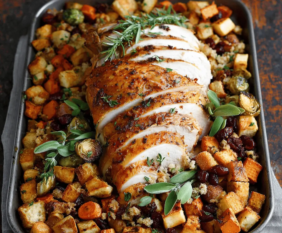 Once cooked, take the pan out of the oven. Let the turkey rest for about 10 minutes before slicing—that allows the juices to settle. After 10 minutes, slice the turkey breast and arrange it on the sheet pan with the roasted veggies and stuffing.