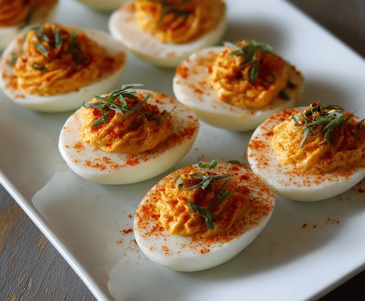 Sprinkle a little smoked paprika or chili powder over the filled eggs for a pop of color and extra flavor. Then add finely sliced green onions or chives on top for a fresh touch!