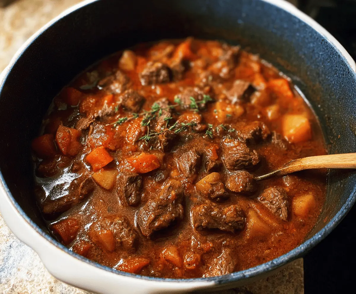 Bring the stew to a gentle boil, then reduce the heat to low and cover the pot. Let it simmer gently for about 1.5 to 2 hours, or until the beef is tender and the vegetables are fully cooked.