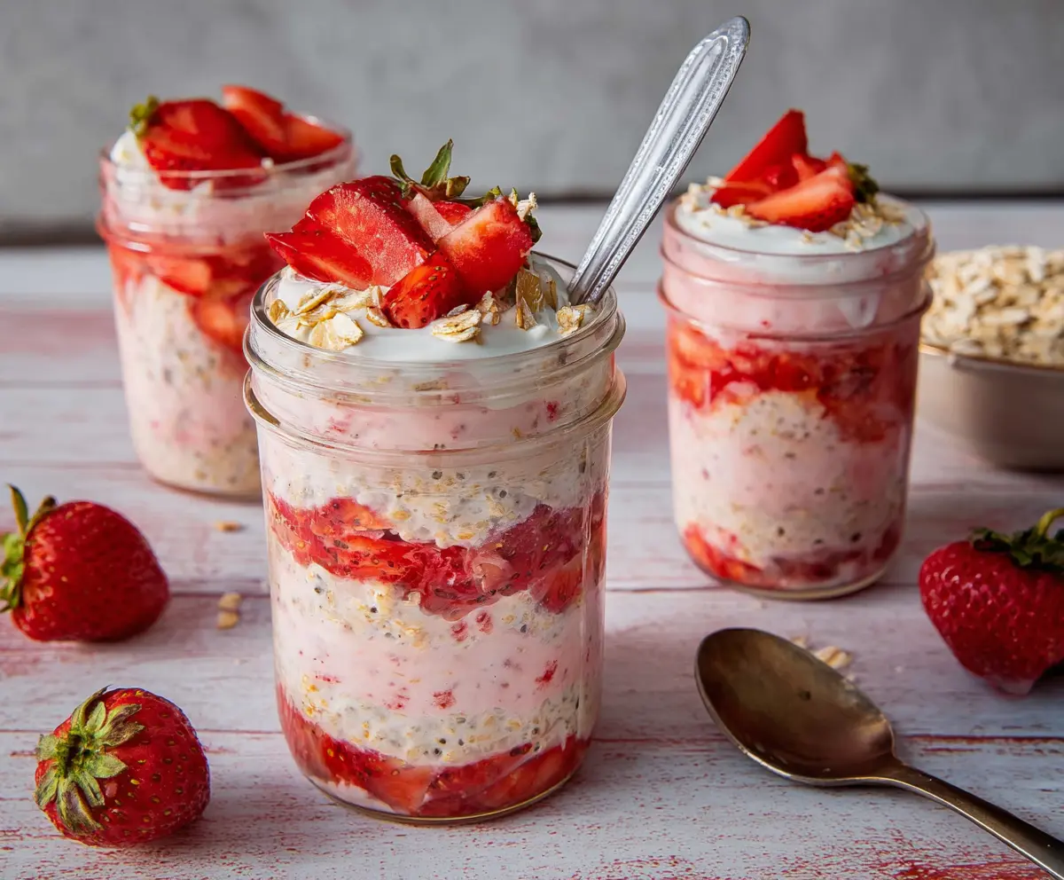 These Strawberry Cheesecake Overnight Oats are a tasty way to start your day! They mix creamy yogurt, sweet strawberries, and crunchy oats for a delicious breakfast treat.