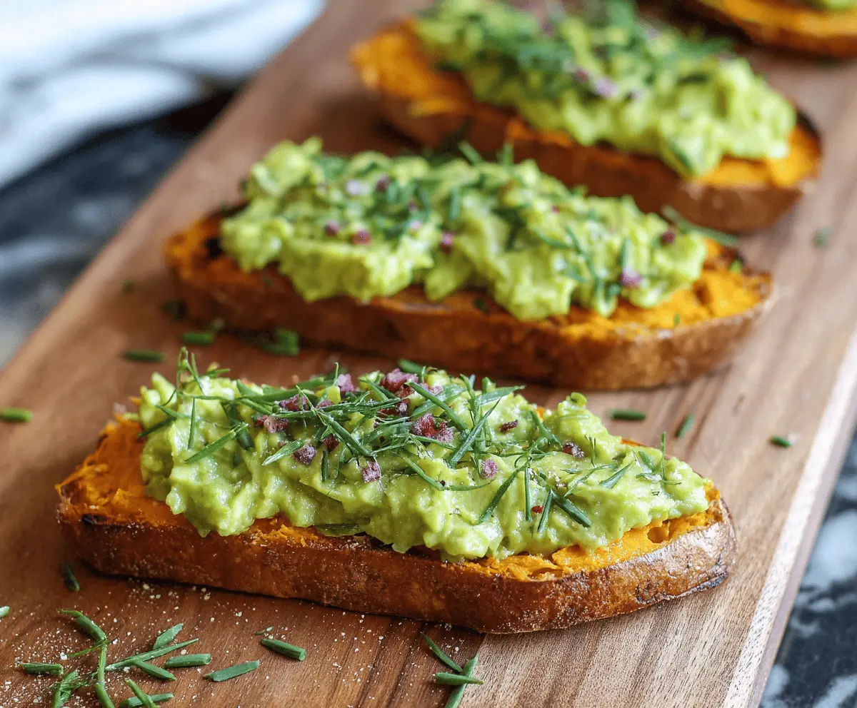 Now it’s time to put it all together! Take each slice of toasted bread and spread a layer of the sweet potato slices on top. Then, spoon the delicious avocado mixture generously over the sweet potato layer, making sure to cover it well.