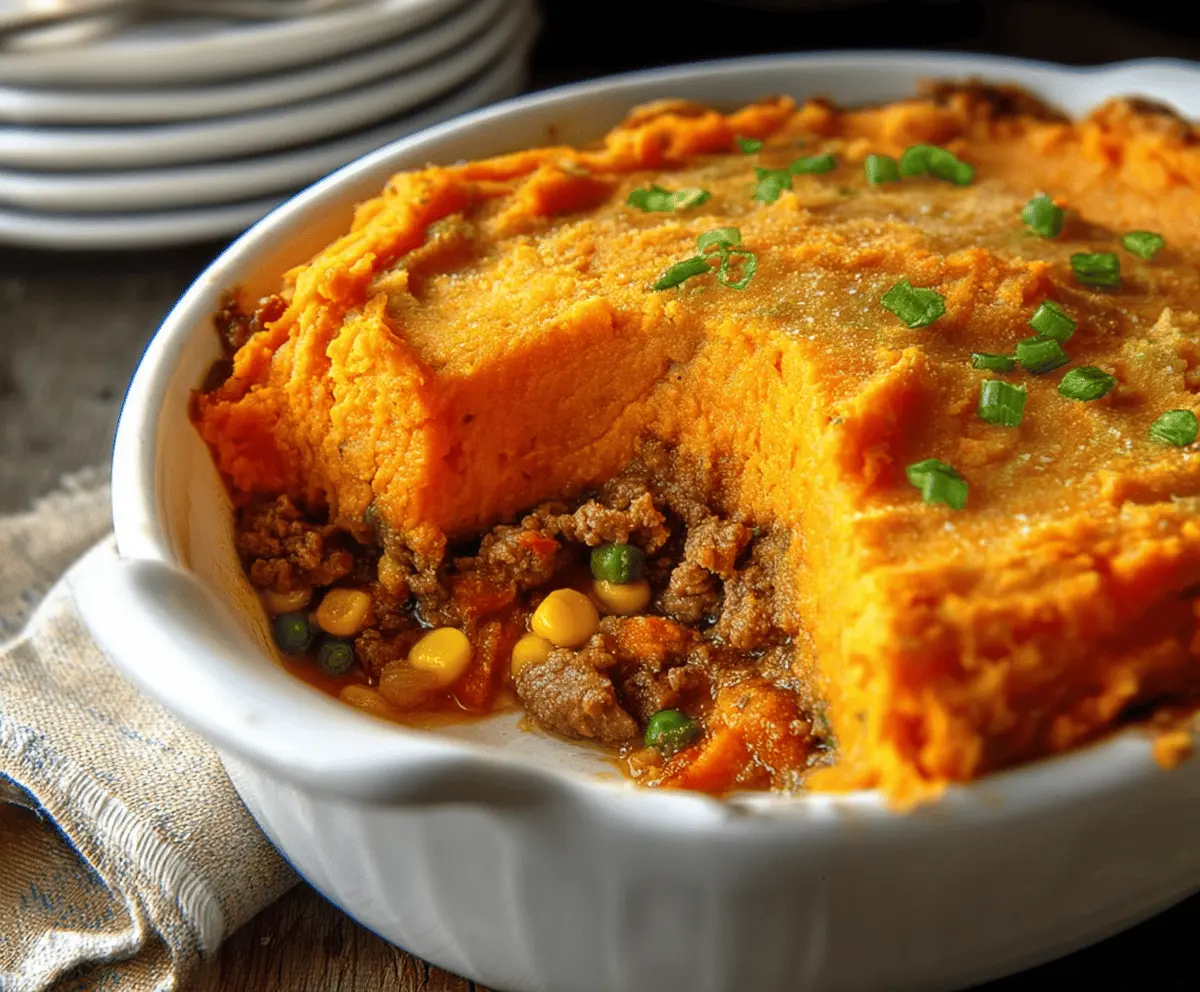 Once baked, take the shepherd’s pie out of the oven and let it rest for about 5 minutes. Just before serving, sprinkle with sliced green onions for a fresh touch. Grab your fork and dig in—enjoy your hearty and delicious Sweet Potato Shepherd’s Pie!