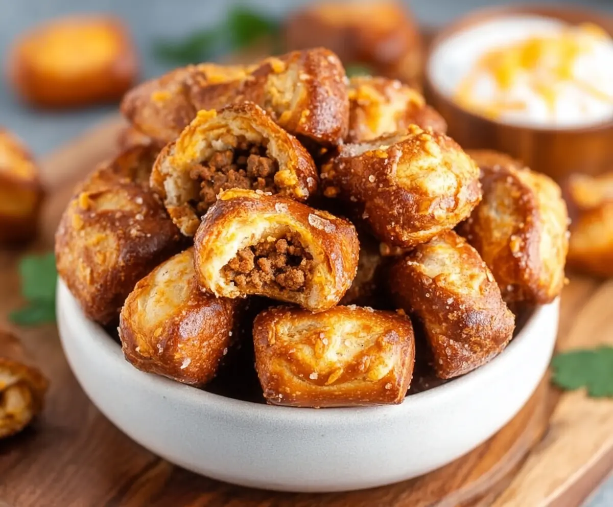 These Taco Pretzel Bites are a fun twist on your normal snack! Soft pretzel dough wraps around taco-flavored filling, making every bite a tasty surprise.